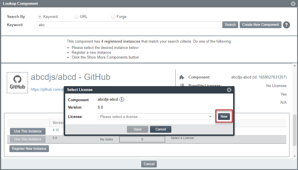 You can create a custom license when you access the Component Lookup feature to register a new component-version-license instance for a “component” inventory item.