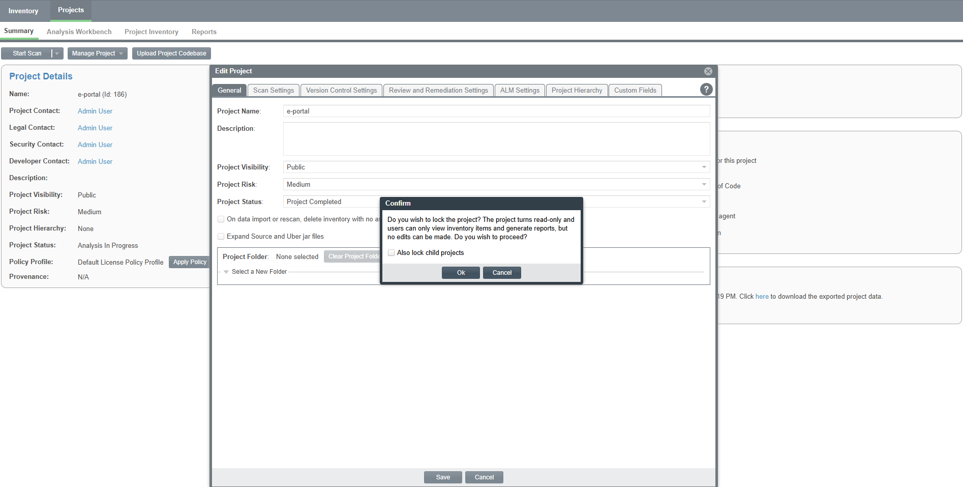 Code Insight allows you to lock a project, ensuring that no further changes can be made once the project has reached its completion status. This feature is particularly useful when both analysis and review processes for the project have been completed and the same project needs to be preserved in a fixed, read-only state for audit or archival purposes. In addition to locking the project, you can also lock its all associated child projects (if applicable) to maintain consistency across the entire project hierarchy.