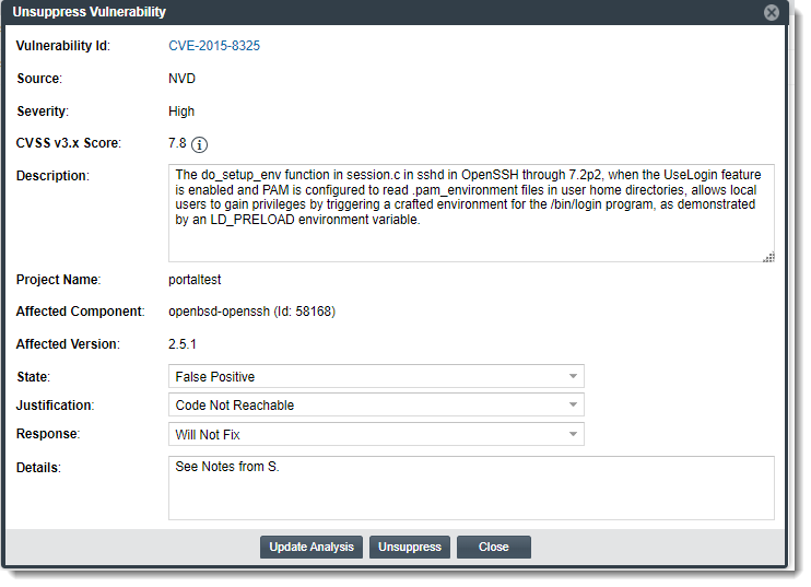 • The vulnerability is removed from the Project subtab of the Suppressed Vulnerabilities tab. In general, the vulnerability should now be visible in the project. For a description of the additional impact of unsuppressing a vulnerability at the project level, see Effects of Unsuppressing a Vulnerability for a Given Project.