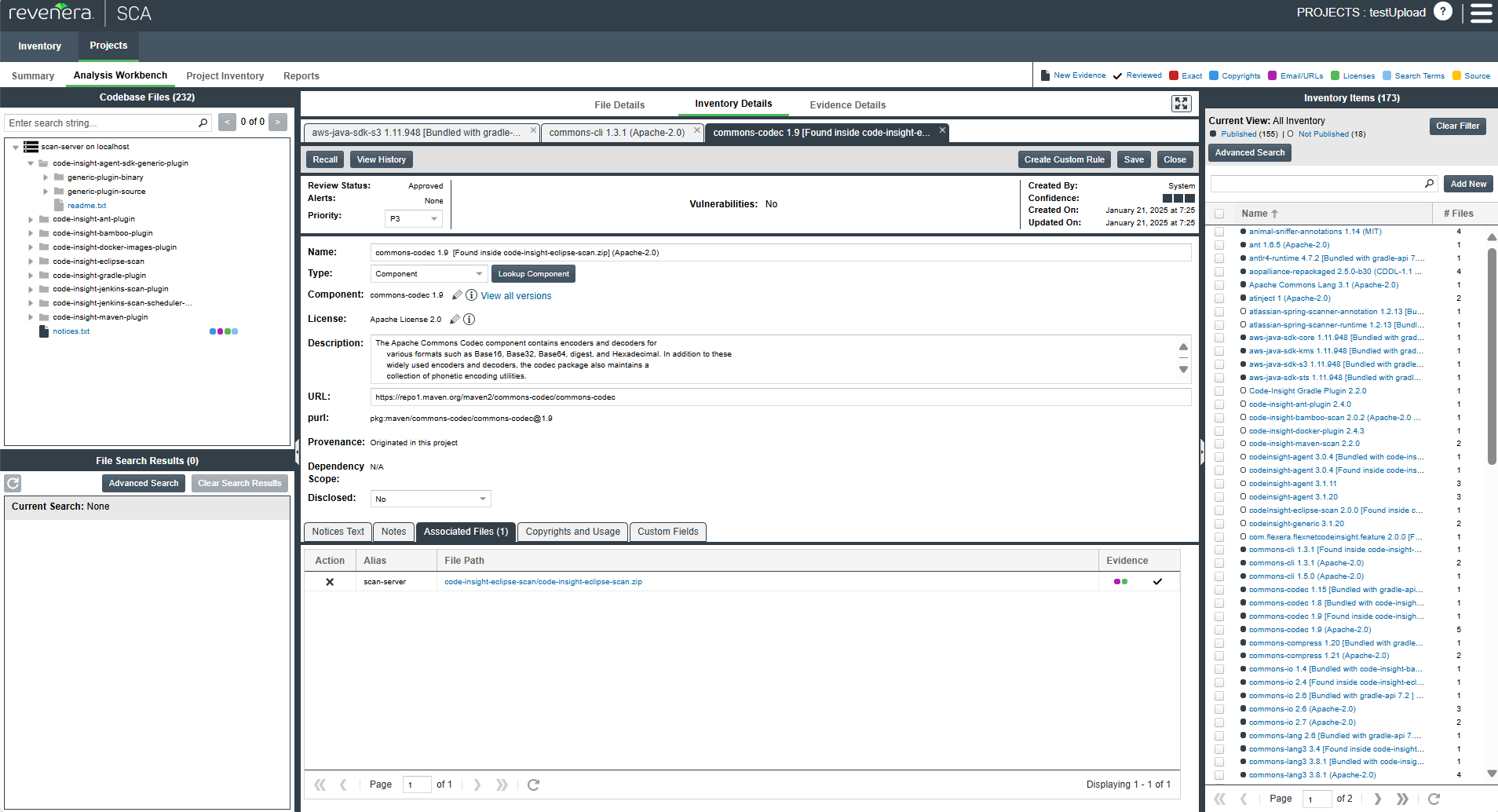 The scanning of codebase files will not generate inventory items that have a matching CVL (Component Version License). However, if multiple inventory items with the same CVL are generated during scanning, these inventory items will be merged with an existing inventory item that has the same CVL, based on the recent updated timestamp of the inventory items. This process updates the Relationship field values, indicating whether it is Parent Inventory or Child Inventory and the Dependency Level field values, specifying whether it is Top-level, Direct, or Transitive on the Project Inventory Details pane—for the existing inventory item. It also updates the file associations in the Associated Files tab—both on the Project Inventory Details pane and on the Inventory Details pane in the Analysis Workbench —for the existing inventory item.